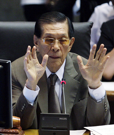 フアン・ポンセ・エンリレさん(元フィリピン国防相)家族によると、13日に自宅で死去、101歳。死因は明らかにされていない=2010年5月撮影、マニラ首都圏ケソン市 【EPA時事】