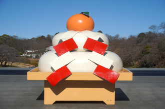 こどもの国(横浜市青葉区奈良町)正面入り口に12月27日、ジャンボ鏡餅が設置された。
