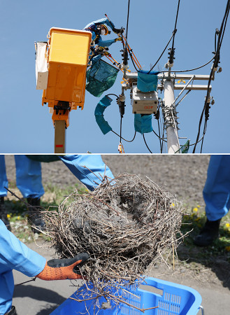 東北電力ネットワークは22日、電柱に作られたカラスの巣の撤去作業を公開した。巣は春に多く作られ、電線に触れると停電の原因になるため、同社は巡回の強化や営巣防止器具設置などの対策を進める=仙台市若林区 【時事通信社】