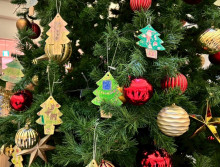 今回は児童にツリー形オーナメントの色付けを依頼。子どもたちは「好きなクリスマス」をテーマにした色付けを行い、約100個を完成させた。