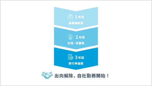 3.企業の体制構築:出向社員との定期面談へのご同席や定期報告など、弊社のマネジメントノウハウの共有を通じて出向期間終了後の受け入れ体制構築の一助としていただきます。