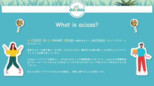 a child in a sweet shop の頭文字をとってaciass(エイシヤス)と名づけました。