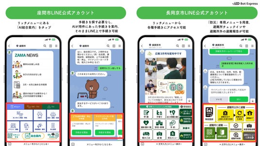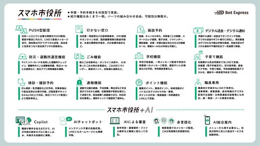 両自治体は、LINE公式アカウントとBot Expressが提供する拡張サービス「スマホ市役所(GovTech Express)」を連携させ、LINEひとつで完結する全庁型の行政サービスを展開しています。さらにAI機能の活用も進み、AIを組み込んだ自治体DXへと発展しています。