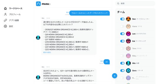 musuは、それぞれ専門分野を持つ複数のAIエージェントが「チーム」として連携し、ユーザーの事業をサポートするAIワークスペースです。エージェント数は無制限。チャット形式で話しかけるだけで、最適な担当エージェントが自動的に割り振られ、リサーチ・メール作成・SNS投稿・スケジュール確認などの業務を実行します。