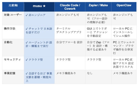 musuは、既存の自動化・AIエージェントツールとは明確に異なる立ち位置にあります。