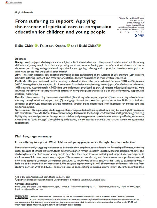 本研究は、ホスピス・緩和ケアの現場で培われてきた視点を基盤に、「苦しみ」と「支え」に関する知見を教育の文脈に応用した点に特徴があります。